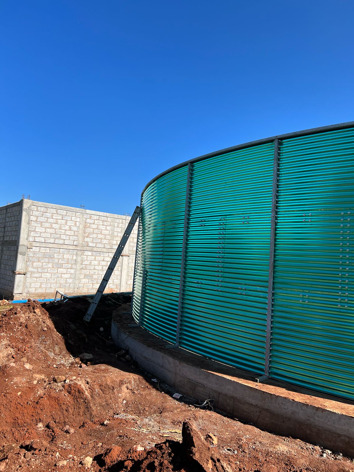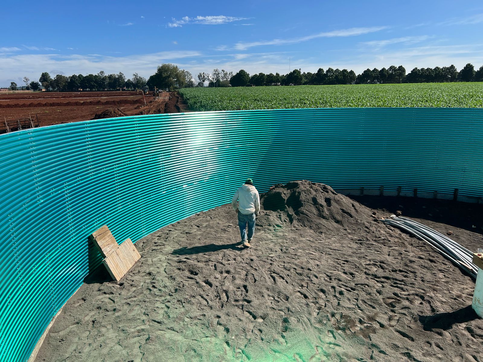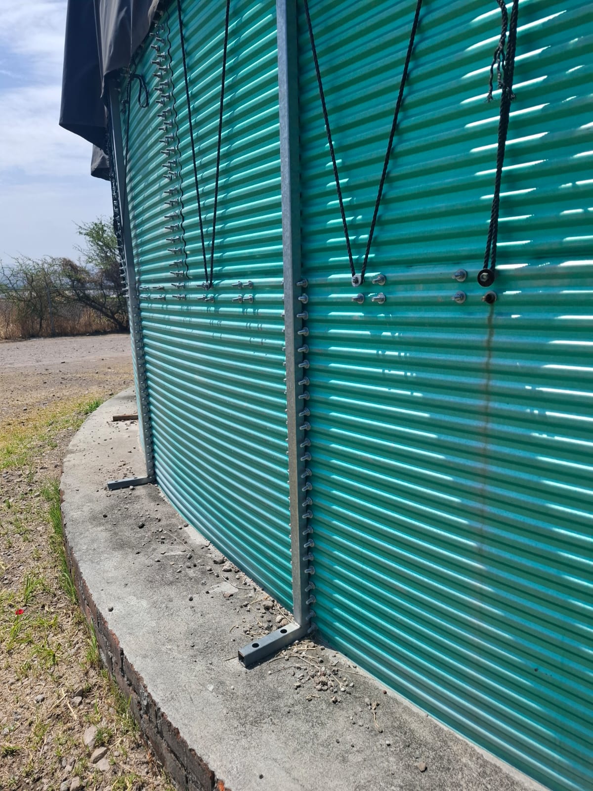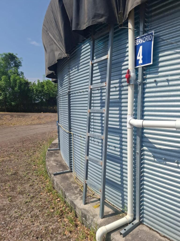 525,000 L tank installed in a rural farm for drip irrigation. Fully assembled in 4 days with internal liner and reinforced galvanized structure.